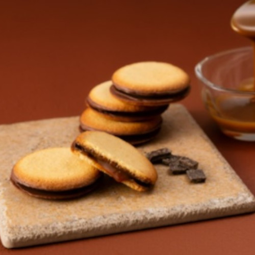 チョコレートの中からとろっと出てくるキャラメルが特長です。生地は低温でじっくりと焼き上げ、焼き色が付きすぎないように仕上げています。さっくりとしたクッキー、くちどけの良いチョコレート、とろけるキャラメルの様々な食感とともに、濃厚で奥深い味わいが口いっぱいに広がるサンドクッキーです。