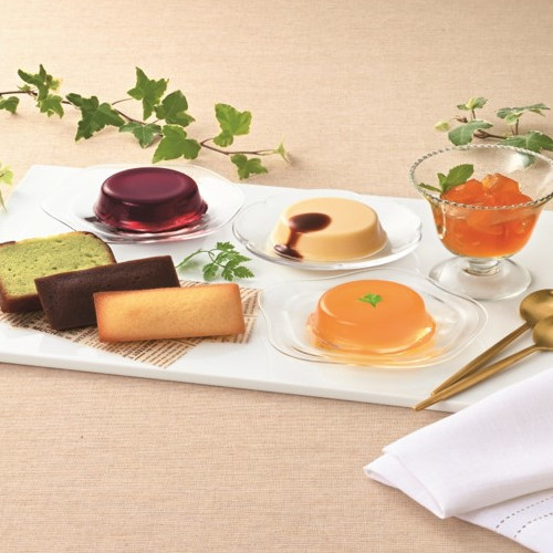 ■内容量:カスタードプリン(カラメルソース付)、北海道産メロン果汁使用ゼリー、グレープゼリー、アップルティーゼリー)各62g×2、フィナンシェ×4、ショコラフィナンシェ×4、メロンパウンドケーキ×3