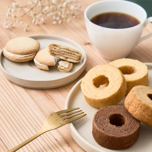 ■内容量:ふんわりバームクーヘン(ミルク・ココア・黒糖×各2)、七層のキャラメルサンドクッキー×2、三喜屋珈琲のレギュラーコーヒー×2