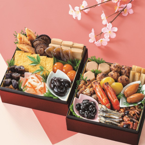 ■内容量:田作り20g、丹波黒黒豆60g、里芋含め煮3個、たたきごぼう70g、にしん一口巻昆布6本、金柑甘露煮70g、栗の甘露煮2個、味付しいたけ3枚、穂先竹の子3切、なます50g、子持ちいかのうま煮2個、だし巻150g、手綱こんにゃく3切、高野豆腐含め煮6切、祝海老2尾、あさりのうま煮60g、紫福豆(珈琲味)75g、ぜいたく煮50g、とりつくね48g