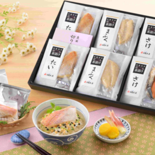 美味しく調味加工した魚の切身と、だしつゆが決め手の魚介系茶漬けの詰合せです。